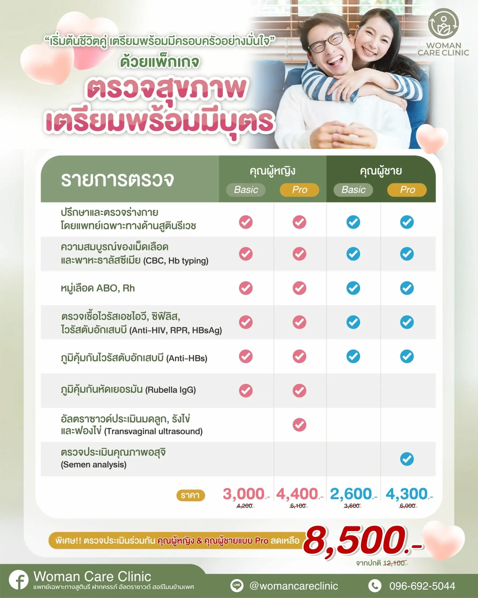 ทาง Woman Care Clinic เรามีบริการตรวจสุขภาพสำหรับเตรียมความพร้อมการมีบุตร ที่ออกแบบมาเพื่อคู่รักทุกท่านโดยเฉพาะค่ะ โดยแบ่งการตรวจเป็นฝั่งคุณผู้หญิงและคุณผู้ชาย ประกอบไปด้วย