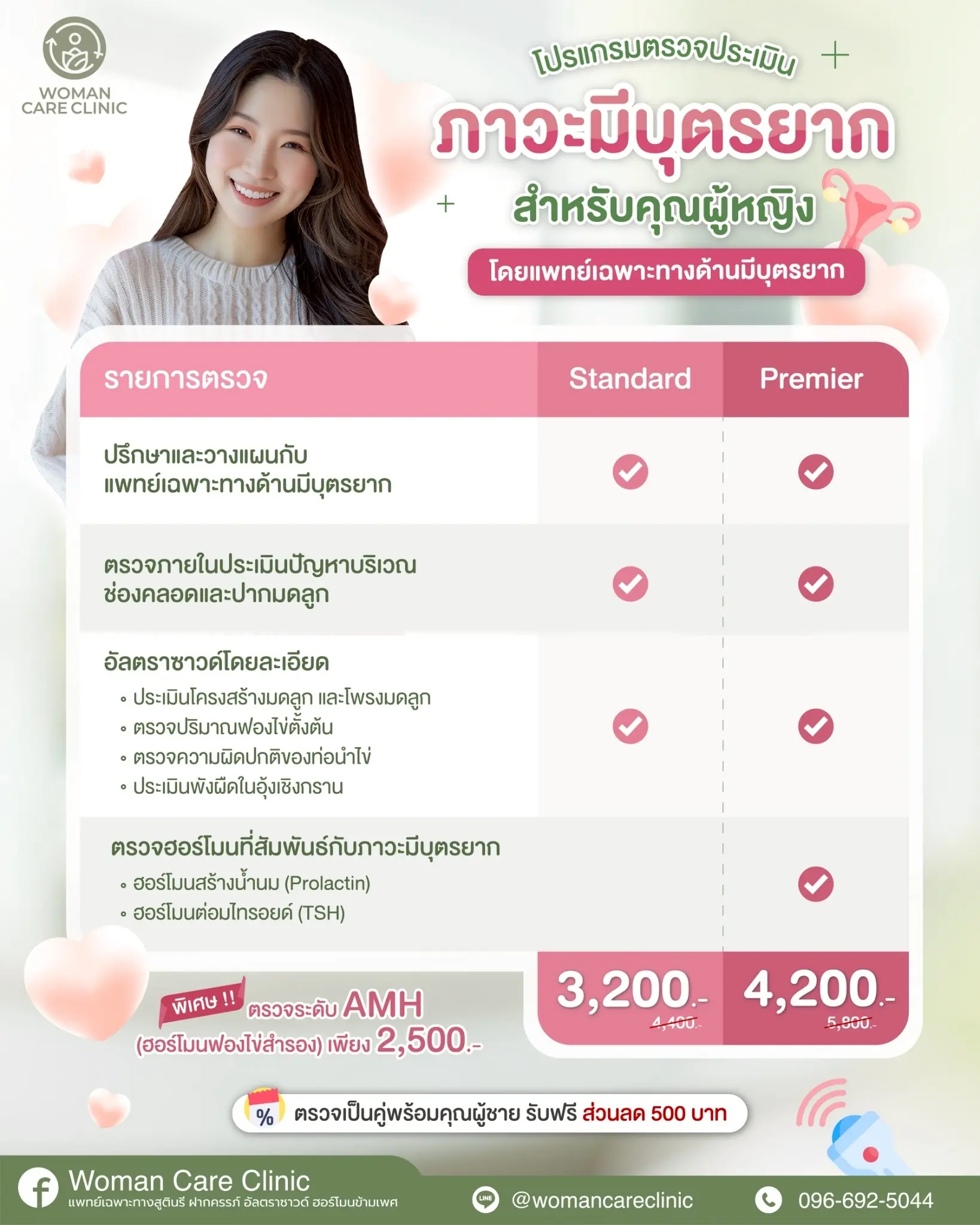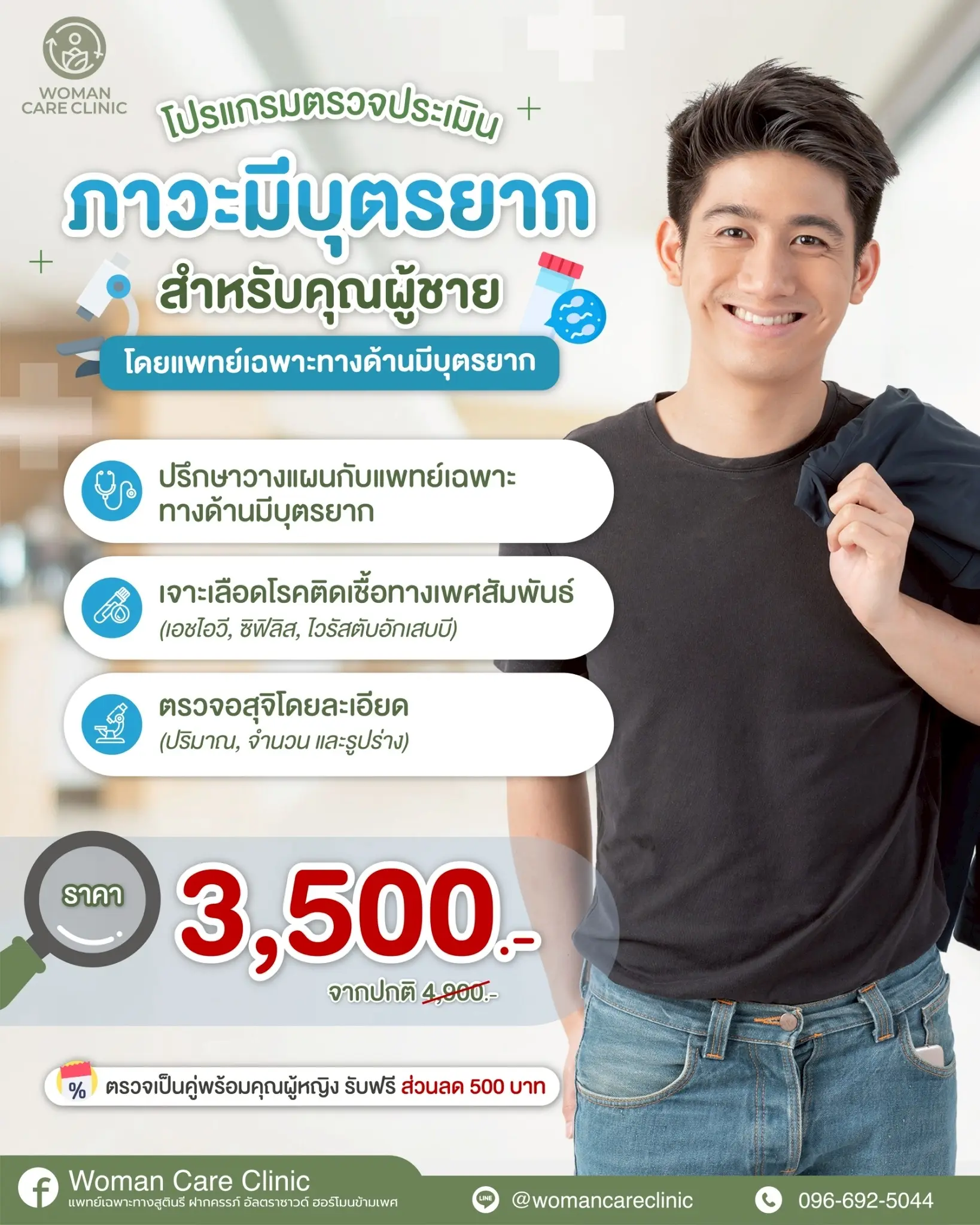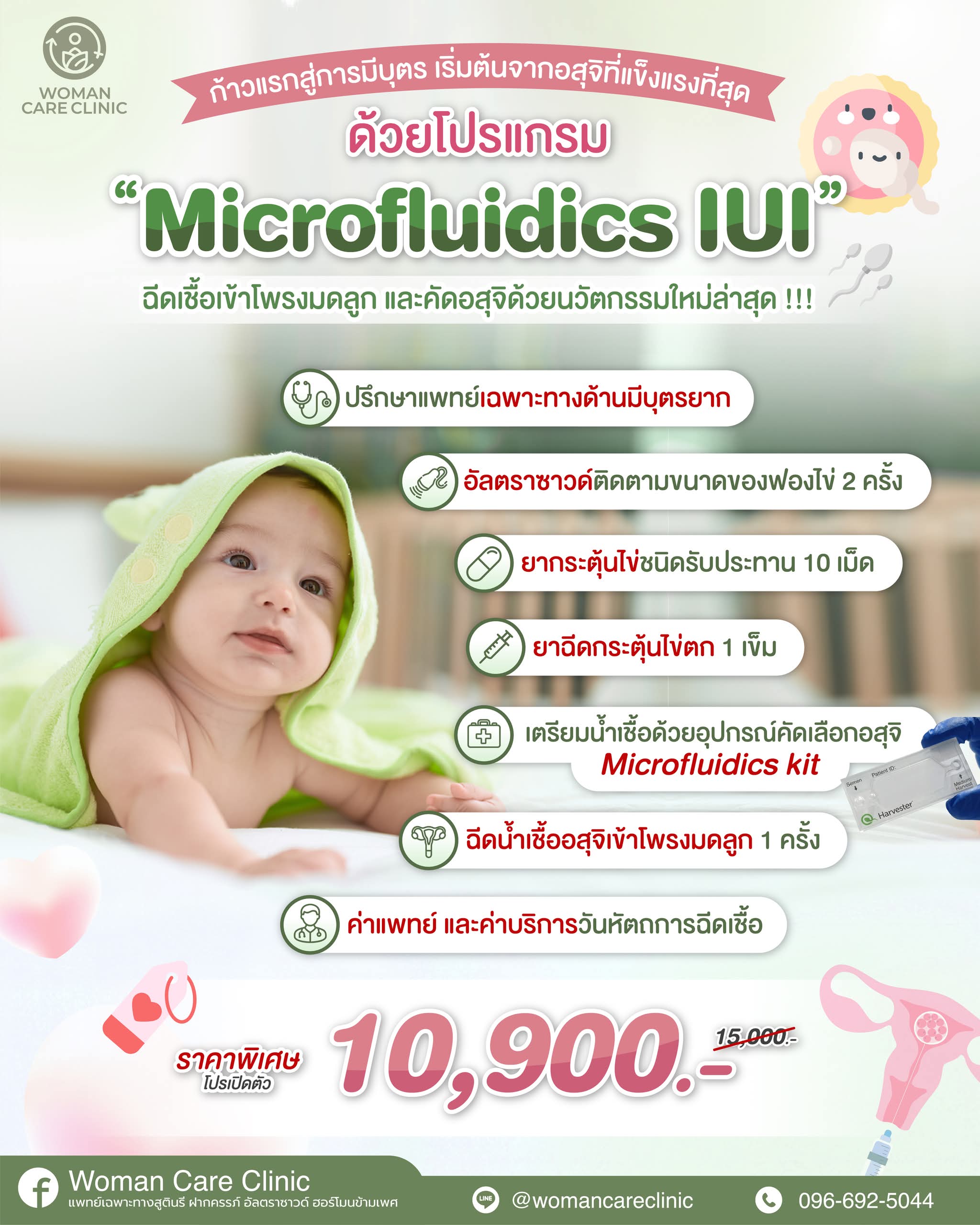 เพียงแค่มาตรวจปรึกษาที่ Woman Care Clinic เราดูแลโดยคุณหมอเฉพาะทางด้านมีบุตรยากผู้มากประสบการณ์ เราเชื่อว่าการรักษาที่ดี ควรได้ออกแบบให้เหมาะสมกับผู้ป่วยแต่ละราย อย่างตรงจุดและครอบคลุมค่ะ สำหรับคู่สมรสที่มีปัญหาเรื่องมีบุตรยากหรือต้องการสอบถามเพิ่มเติม สามารถทักสอบถามเพื่อทำนัดผ่านทาง เบอร์ 096-692-5044 หรือ line : @womancareclinic (มี@) ได้ตลอดเวลาเลยนะคะ